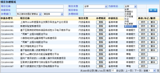 如上图所示,可以查询具体的项目名称,类型等字段,方便企业查询;先前这里填报的都可进行查询、修改、补正 以及撤销等操作。