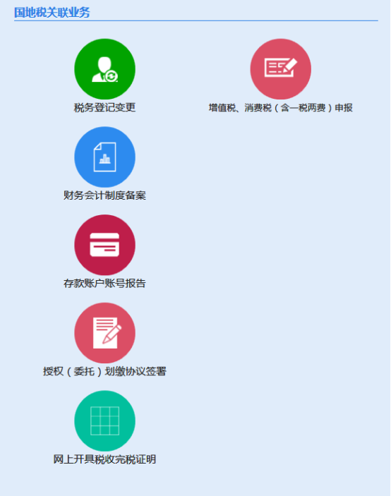 包含税务登记变更、财务会计制度备案、存款账户账号报告、授权(委托)划缴协议签署(原三方协议签署)、网上开具税收完税证明、增值税消费税(含一税两费)申报,其中,税务登记变更、财务会计制度备案两个功能根据用户登记信息的不同,进入的功能界面及控制逻辑也不同。详见“关联业务操作指南”。