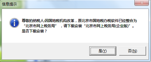 启动原北京国税办税软件:如果本地已经安装北京市网上税务局(企业版)软件,将直接启动北京市网上税务局(企业版)软件;如果本地没有安装北京市网上税务局(企业版)软件,则弹出如下图所示提示,点击“是”后打开北京市网上税务局(企业版)软件安装下载页面,然后按照上文“安装”流程完成北京市网上税务局(企业版)软件的安装。