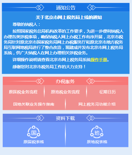 按照国家税务总局机构改革的工作要求,为进一步便利纳税人办理各类涉税事项,确保纳税人网上办税工作有序开展,国家税务总局北京市税务局针对原北京市国家税务局网上办税服务厅和原北京市地方税务局互联网地税局进行了整合改造,建成并发布北京市网上税务局(企业版)系统。