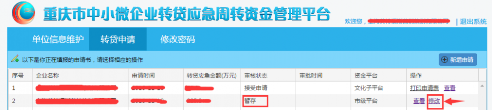 企业全部填写完成后可以点击“暂存”按钮,暂存状态是未提交转贷申请信息的未提交,企业可以进行修改操作,列表显示如图所示