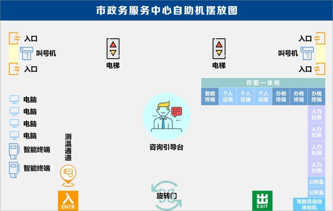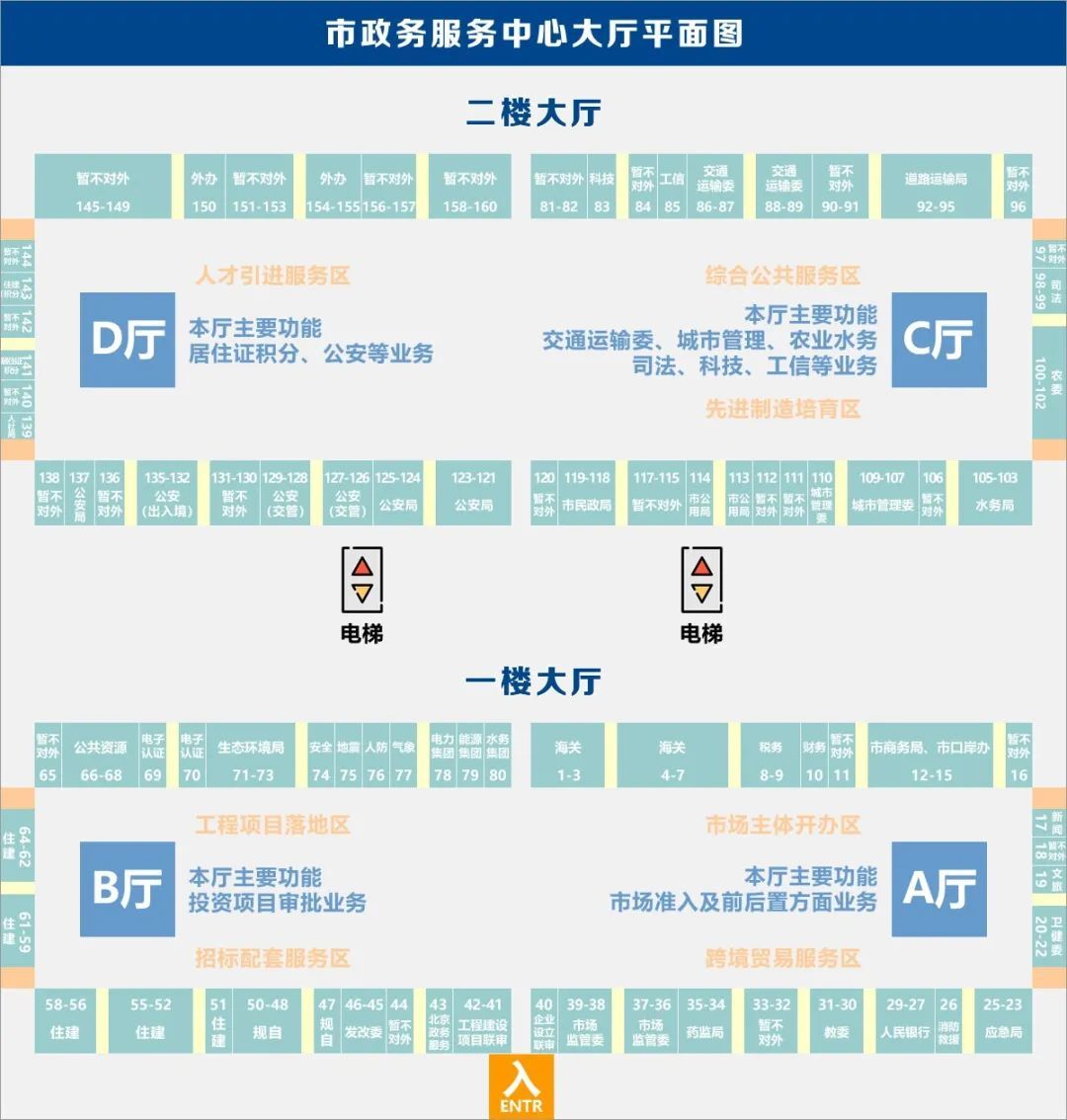大厅分为ABCD四个厅。其中A厅主要功能是办理市场准入及前后置方面业务,B厅主要办理投资项目审批业务,C厅主要办理交通运输委、城市管理、农业水务、司法、科技、工信等业务,D厅主要办理居住证积分、公安等业务。