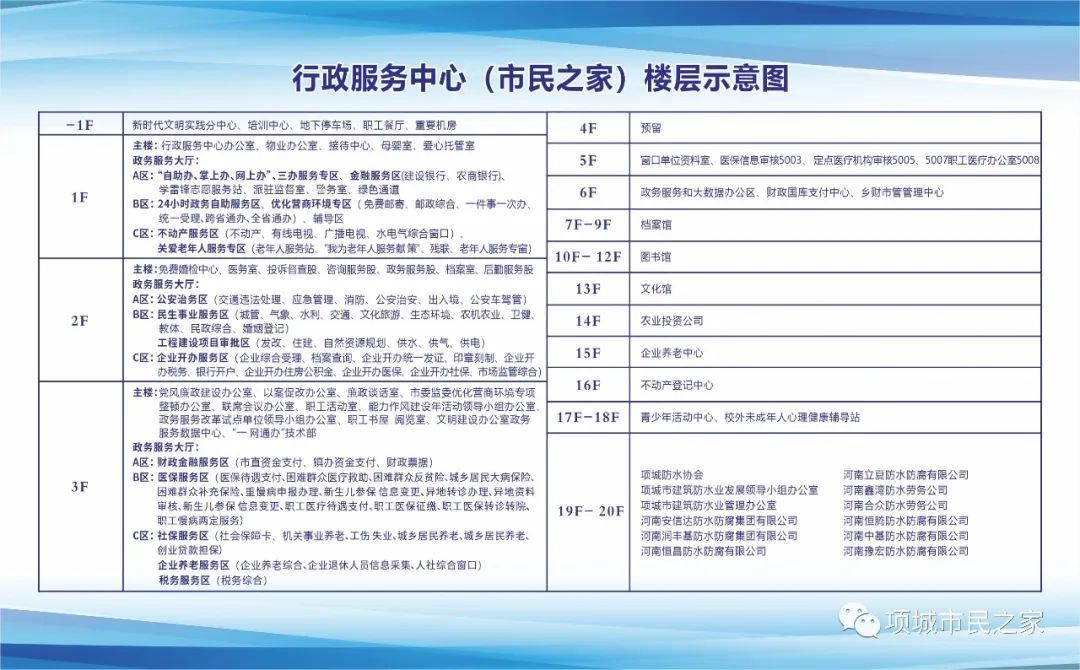 项城市民之家于2018年11月份投入使用,雄居项城核心位置城南新区,总投资2亿元,占地82亩,政务大厅占地30亩,配套停车场52亩,总建筑面积4万平方米。建筑采用主楼+裙楼模式,主楼21层,1.5万平方米,1-6层为办公服务区,7-9层为档案馆,10-13层为图书文化服务区,14层为农业投资公司办公区,15-16层为民生事业服务区,17-18层为青少年活动中心,19-20层为防水总部高新企业办公区。裙楼4层,建筑面积2.5万平方米,1-3层是政务服务大厅,共设置窗口220个,窗口采取“前台后室”的模式,实行前台受理,后台审批。4层为市政府“我来办”办公室,主要是服务招商引资项目建设,为企业开展代理代办等服务。