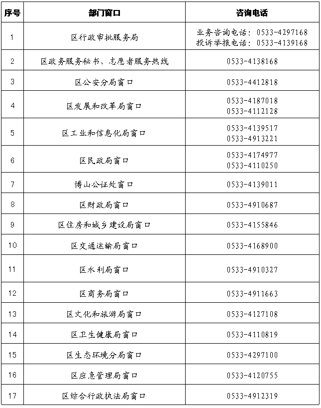 博山区政务服务咨询服务(24小时值班)电话:0533-4297168
