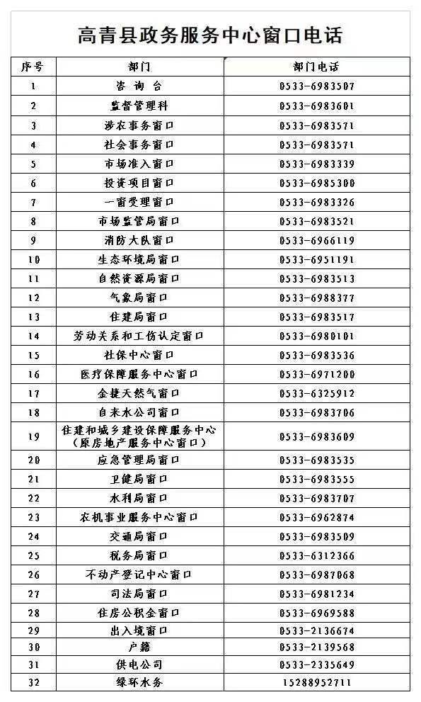 高青县政务服务咨询服务(24小时值班)电话:0533-6983601。