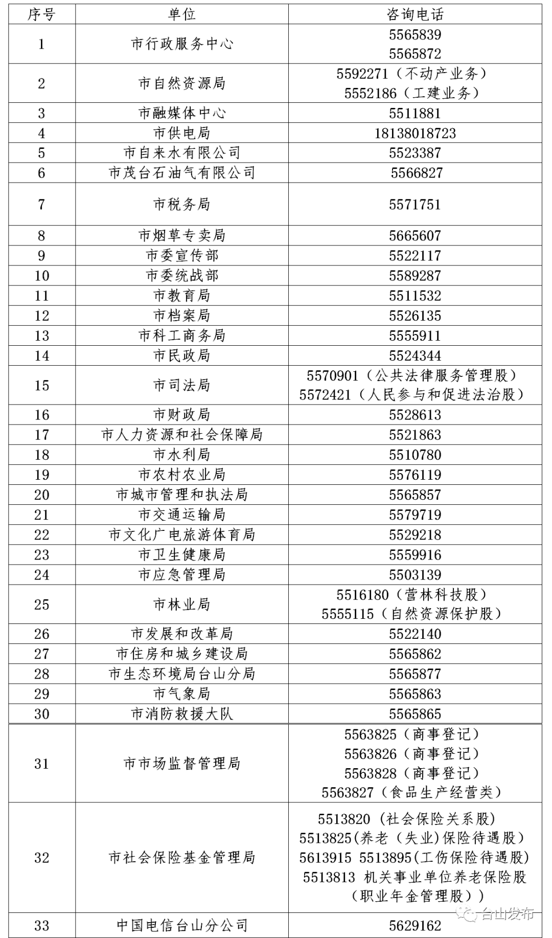 36个进驻单位包括:台山市委统战部(市民族宗教局)、台山市发展和改革局、市科工商务局、市教育局、市公安局、市消防大队、市民政局、市司法局、市财政局、市人力资源和社会保障局、市国土资源局、市环境保护局、市住房和城乡建设局、市交通运输局、市水务局、市农业局、市林业局、市文化广电新闻出版局、市卫生和计划生育局、市外事侨务局、市海洋与渔业局、市市场监督管理局、市安全生产监督管理局、市食品药品监督管理局、市城市综合管理局、市城乡规划局、市粮食局、市体育局、市档案局、市保密局、市人防办、市社会保险基金管理局、市不动产登记局、市税务局、台山公路局、市气象局等单位。