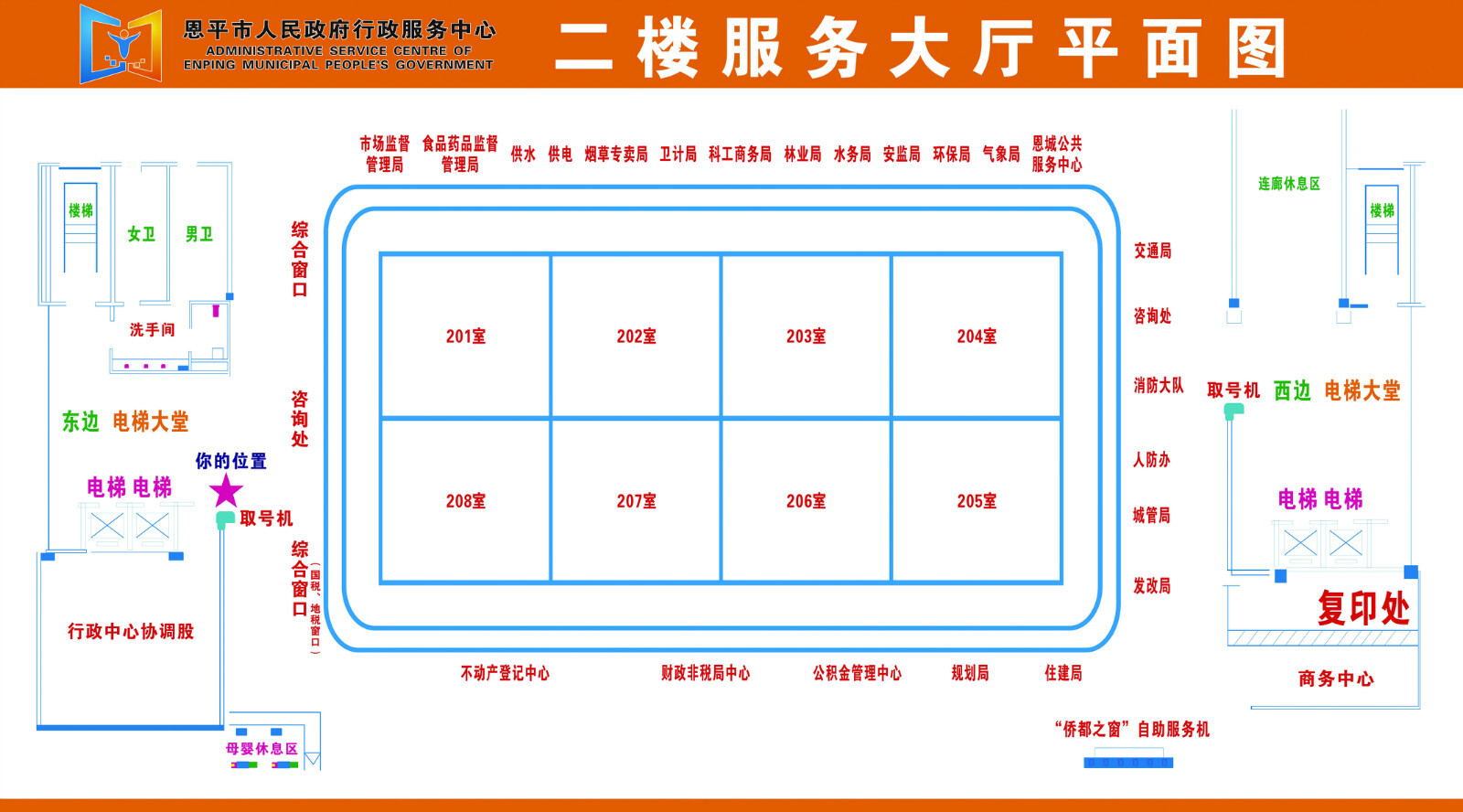 二楼综合服务大厅有市自然资源局、市场监督管理局、恩城街道办公共服务中心等18个进驻部门。二楼综合大厅主要分成五大区域:企业设立类综合窗口、企业许可类综合窗口、投资建设类窗口、不动产登记窗口以及恩城街道办公共服务中心。此外,二楼东侧设有广东省网上办事大厅自助区以及开办企业便利化自助区,办事群众或企业可在自助区自行获取或打印办事指南、政策法规、表格文书以及查询办理结果等。