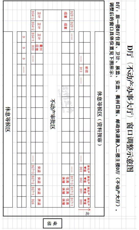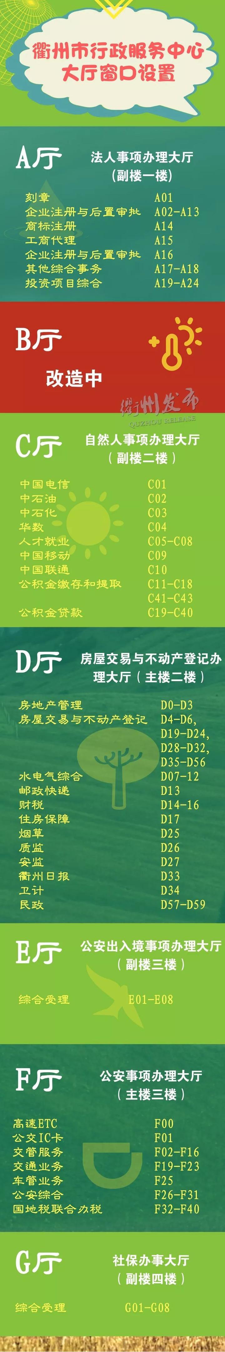 届时,原在B厅办理的相关事项(主要有:国地税联合办税、交通相关业务、住建相关业务、卫计相关业务、质监、安监、烟草、商标注册、工商代理、刻章、衢州日报、邮政快递等)将分流至A厅(一楼副楼:法人办事大厅)、D厅(二楼主楼:不动产办事大厅)、F厅(三楼主楼:公安办事大厅)。