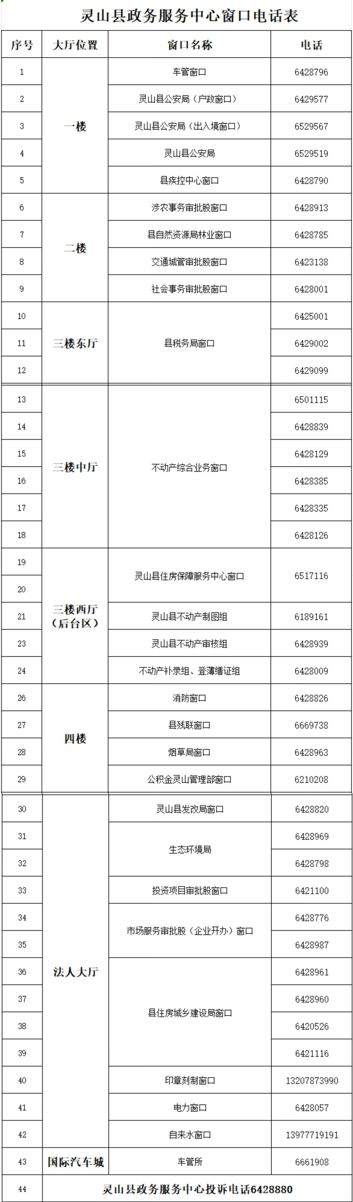 (一)独立服务窗口。共10个单位:县公安局、县自然资源局(不动产综合窗口)、县住房城乡建设局、县交通运输局(运管所)、县卫生健康局(疾控中心)、县行政审批局、县消防救援大队、灵山生态环境局、县税务局、县烟草专卖局。