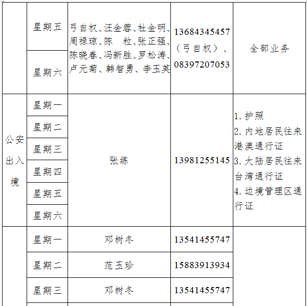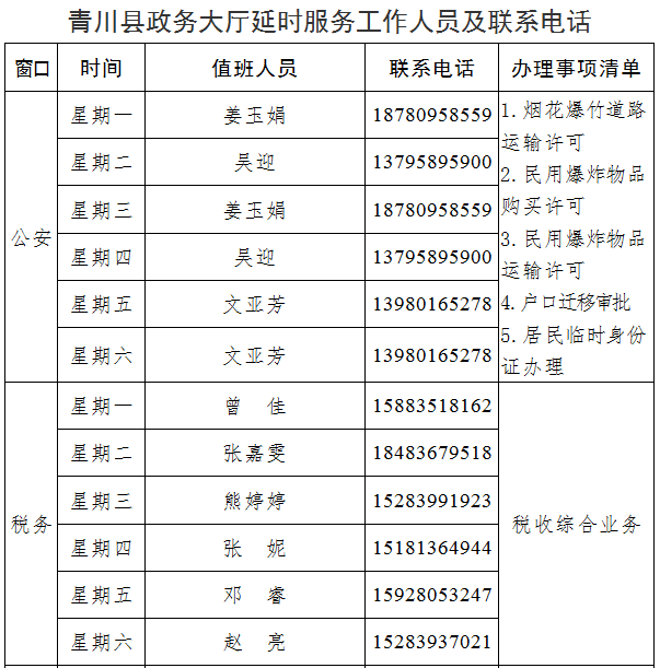 星期六上午9:00-11:30实行预约延时服务,为预约对象提供正常服务。企业和群众提前一个工作日进行预约,预约方式为电话预约、现场预约。(受理预约人、电话、事项详见附件)