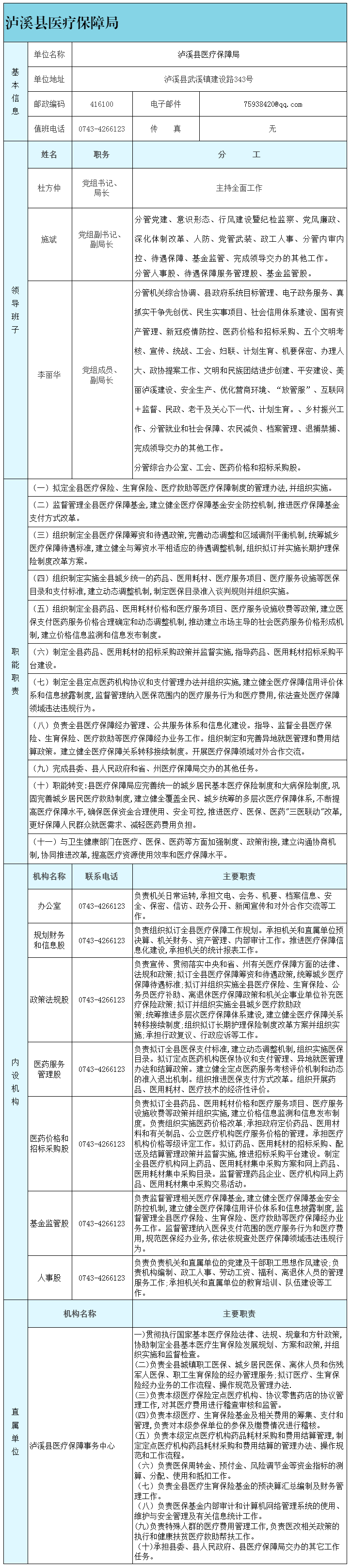 泸溪县医疗保障局内设机构8个分别为:1、办公室;2、财务股;3、审核股;4、稽查股;5、征缴股;6、信息股;7、综合服务大厅;8、结算股。