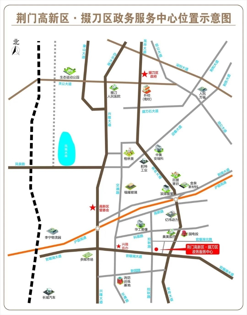 2021年7月5日起,高德地图、腾讯地图、百度地图、微信导航服务将同步更新名称和地址,搜索“荆门高新区·掇刀区政务服务中心”或“荆门市掇刀区官堰湖大道88号”即可导航至目的地。