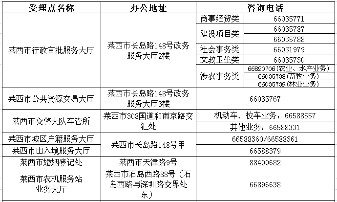 莱西市政务服务中心位于莱西市长岛路148号 ,莱西市政务服务中心A座三层(社会事务类大厅)进驻:市行政审批局(涉农事务科)、市行政审批局(文教卫生科)、市行政审批局(社会事务科)、市行政审批局(商事经贸科)、市交通运输局、市市场监管局、市税务局、公章刻制等部门和市行政审批局科室。