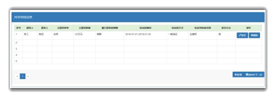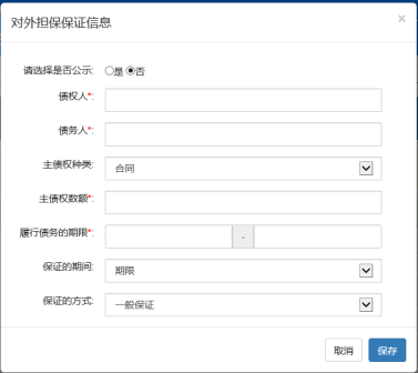点击“新增”按钮,弹出编辑窗口,企业如实填写年报年度内企业对外提供保证担保信息,点击“保存”按钮,成功后页面自动关闭。